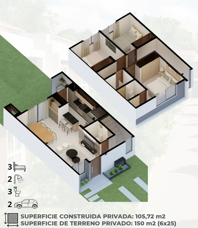 Moderna Casa Tipo A en el exclusivo condominio Parana Village, ubicado en el barrio Potrero, San Juan del Paraná. Con un diseño contemporáneo de líneas limpias y amplios ventanales, esta vivienda de 150 m² combina estilo, confort y funcionalidad.